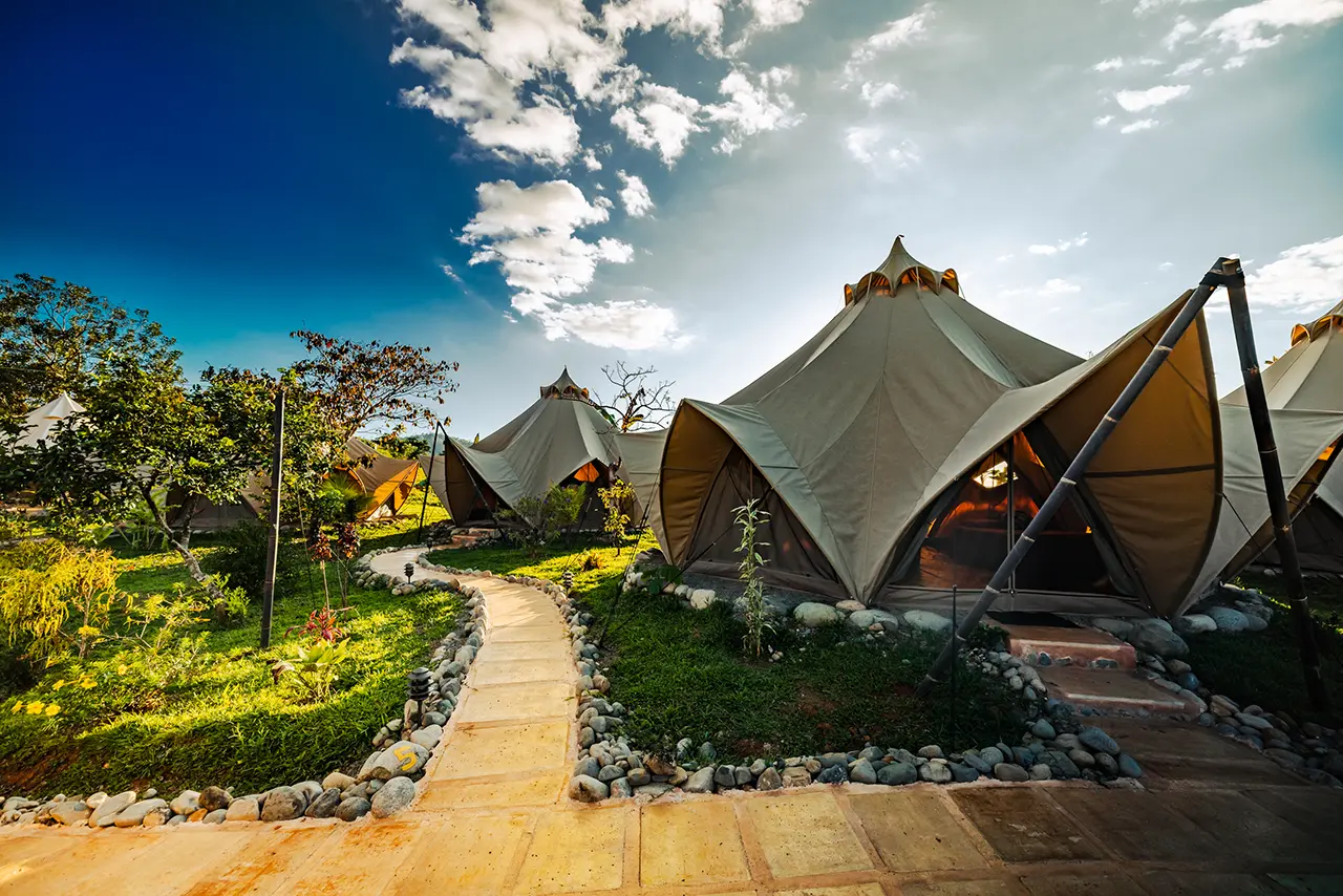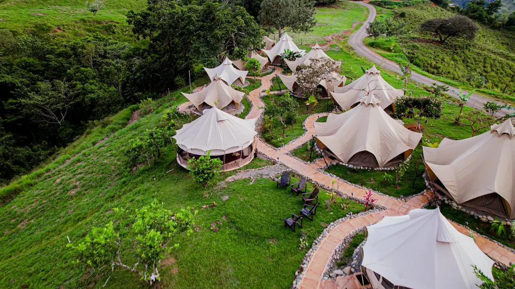 - Secluded and social spaces like hammocks, yoga shalas, and garden meditation areas